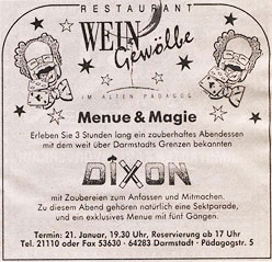 | Die Stunden verfliegen schnell und genussreich, indem der Gastgeber mit Magie und Menue das Besondere bietet ! Eine Konzeption, die den Rahmen des heute üblichen sprengt. |